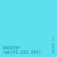 Цвет #5CDFEF в цветовой модели RGB обозначается тремя октетами (92, 223, 239) в десятичном формате и #5CDFEF в шестнадцатиричном (hex) формате, которые являются интенсивностью красного 92 (hex 5C), интенсивность зелёного 223 (hex DF) и интенсивность синего 239 (hex EF).