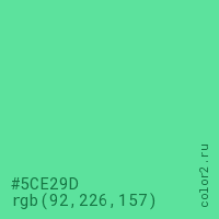 Цвет #5CE29D в цветовой модели RGB обозначается тремя октетами (92, 226, 157) в десятичном формате и #5CE29D в шестнадцатиричном (hex) формате, которые являются интенсивностью красного 92 (hex 5C), интенсивность зелёного 226 (hex E2) и интенсивность синего 157 (hex 9D).