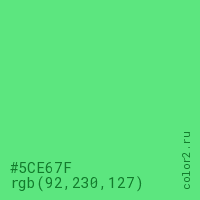 Цвет #5CE67F в цветовой модели RGB обозначается тремя октетами (92, 230, 127) в десятичном формате и #5CE67F в шестнадцатиричном (hex) формате, которые являются интенсивностью красного 92 (hex 5C), интенсивность зелёного 230 (hex E6) и интенсивность синего 127 (hex 7F).