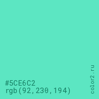Цвет #5CE6C2 в цветовой модели RGB обозначается тремя октетами (92, 230, 194) в десятичном формате и #5CE6C2 в шестнадцатиричном (hex) формате, которые являются интенсивностью красного 92 (hex 5C), интенсивность зелёного 230 (hex E6) и интенсивность синего 194 (hex C2).