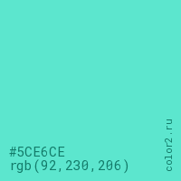 Цвет #5CE6CE в цветовой модели RGB обозначается тремя октетами (92, 230, 206) в десятичном формате и #5CE6CE в шестнадцатиричном (hex) формате, которые являются интенсивностью красного 92 (hex 5C), интенсивность зелёного 230 (hex E6) и интенсивность синего 206 (hex CE).