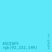 Цвет #5CE8F9 в цветовой модели RGB обозначается тремя октетами (92, 232, 249) в десятичном формате и #5CE8F9 в шестнадцатиричном (hex) формате, которые являются интенсивностью красного 92 (hex 5C), интенсивность зелёного 232 (hex E8) и интенсивность синего 249 (hex F9).