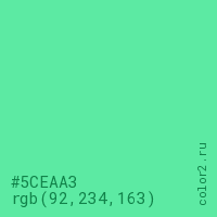 Цвет #5CEAA3 в цветовой модели RGB обозначается тремя октетами (92, 234, 163) в десятичном формате и #5CEAA3 в шестнадцатиричном (hex) формате, которые являются интенсивностью красного 92 (hex 5C), интенсивность зелёного 234 (hex EA) и интенсивность синего 163 (hex A3).