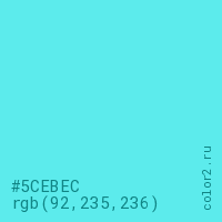 Цвет #5CEBEC в цветовой модели RGB обозначается тремя октетами (92, 235, 236) в десятичном формате и #5CEBEC в шестнадцатиричном (hex) формате, которые являются интенсивностью красного 92 (hex 5C), интенсивность зелёного 235 (hex EB) и интенсивность синего 236 (hex EC).