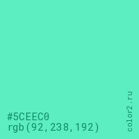Цвет #5CEEC0 в цветовой модели RGB обозначается тремя октетами (92, 238, 192) в десятичном формате и #5CEEC0 в шестнадцатиричном (hex) формате, которые являются интенсивностью красного 92 (hex 5C), интенсивность зелёного 238 (hex EE) и интенсивность синего 192 (hex C0).