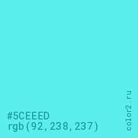 Цвет #5CEEED в цветовой модели RGB обозначается тремя октетами (92, 238, 237) в десятичном формате и #5CEEED в шестнадцатиричном (hex) формате, которые являются интенсивностью красного 92 (hex 5C), интенсивность зелёного 238 (hex EE) и интенсивность синего 237 (hex ED).