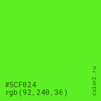Цвет #5CF024 в цветовой модели RGB обозначается тремя октетами (92, 240, 36) в десятичном формате и #5CF024 в шестнадцатиричном (hex) формате, которые являются интенсивностью красного 92 (hex 5C), интенсивность зелёного 240 (hex F0) и интенсивность синего 36 (hex 24).