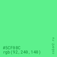 Цвет #5CF08C в цветовой модели RGB обозначается тремя октетами (92, 240, 140) в десятичном формате и #5CF08C в шестнадцатиричном (hex) формате, которые являются интенсивностью красного 92 (hex 5C), интенсивность зелёного 240 (hex F0) и интенсивность синего 140 (hex 8C).