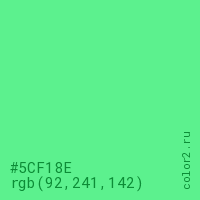 Цвет #5CF18E в цветовой модели RGB обозначается тремя октетами (92, 241, 142) в десятичном формате и #5CF18E в шестнадцатиричном (hex) формате, которые являются интенсивностью красного 92 (hex 5C), интенсивность зелёного 241 (hex F1) и интенсивность синего 142 (hex 8E).