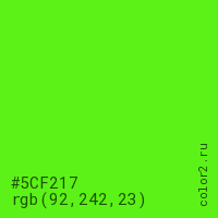 Цвет #5CF217 в цветовой модели RGB обозначается тремя октетами (92, 242, 23) в десятичном формате и #5CF217 в шестнадцатиричном (hex) формате, которые являются интенсивностью красного 92 (hex 5C), интенсивность зелёного 242 (hex F2) и интенсивность синего 23 (hex 17).