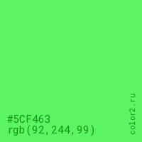 Цвет #5CF463 в цветовой модели RGB обозначается тремя октетами (92, 244, 99) в десятичном формате и #5CF463 в шестнадцатиричном (hex) формате, которые являются интенсивностью красного 92 (hex 5C), интенсивность зелёного 244 (hex F4) и интенсивность синего 99 (hex 63).