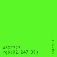 Цвет #5CF727 в цветовой модели RGB обозначается тремя октетами (92, 247, 39) в десятичном формате и #5CF727 в шестнадцатиричном (hex) формате, которые являются интенсивностью красного 92 (hex 5C), интенсивность зелёного 247 (hex F7) и интенсивность синего 39 (hex 27).