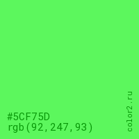 Цвет #5CF75D в цветовой модели RGB обозначается тремя октетами (92, 247, 93) в десятичном формате и #5CF75D в шестнадцатиричном (hex) формате, которые являются интенсивностью красного 92 (hex 5C), интенсивность зелёного 247 (hex F7) и интенсивность синего 93 (hex 5D).