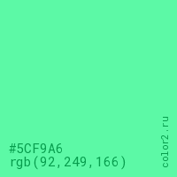 Цвет #5CF9A6 в цветовой модели RGB обозначается тремя октетами (92, 249, 166) в десятичном формате и #5CF9A6 в шестнадцатиричном (hex) формате, которые являются интенсивностью красного 92 (hex 5C), интенсивность зелёного 249 (hex F9) и интенсивность синего 166 (hex A6).