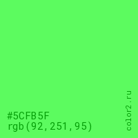 Цвет #5CFB5F в цветовой модели RGB обозначается тремя октетами (92, 251, 95) в десятичном формате и #5CFB5F в шестнадцатиричном (hex) формате, которые являются интенсивностью красного 92 (hex 5C), интенсивность зелёного 251 (hex FB) и интенсивность синего 95 (hex 5F).