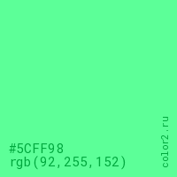 Цвет #5CFF98 в цветовой модели RGB обозначается тремя октетами (92, 255, 152) в десятичном формате и #5CFF98 в шестнадцатиричном (hex) формате, которые являются интенсивностью красного 92 (hex 5C), интенсивность зелёного 255 (hex FF) и интенсивность синего 152 (hex 98).