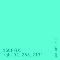 Цвет #5CFFD5 в цветовой модели RGB обозначается тремя октетами (92, 255, 213) в десятичном формате и #5CFFD5 в шестнадцатиричном (hex) формате, которые являются интенсивностью красного 92 (hex 5C), интенсивность зелёного 255 (hex FF) и интенсивность синего 213 (hex D5).