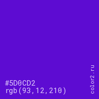 Цвет #5D0CD2 в цветовой модели RGB обозначается тремя октетами (93, 12, 210) в десятичном формате и #5D0CD2 в шестнадцатиричном (hex) формате, которые являются интенсивностью красного 93 (hex 5D), интенсивность зелёного 12 (hex 0C) и интенсивность синего 210 (hex D2).