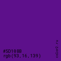 Цвет #5D108B в цветовой модели RGB обозначается тремя октетами (93, 16, 139) в десятичном формате и #5D108B в шестнадцатиричном (hex) формате, которые являются интенсивностью красного 93 (hex 5D), интенсивность зелёного 16 (hex 10) и интенсивность синего 139 (hex 8B).