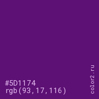Цвет #5D1174 в цветовой модели RGB обозначается тремя октетами (93, 17, 116) в десятичном формате и #5D1174 в шестнадцатиричном (hex) формате, которые являются интенсивностью красного 93 (hex 5D), интенсивность зелёного 17 (hex 11) и интенсивность синего 116 (hex 74).