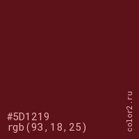Цвет #5D1219 в цветовой модели RGB обозначается тремя октетами (93, 18, 25) в десятичном формате и #5D1219 в шестнадцатиричном (hex) формате, которые являются интенсивностью красного 93 (hex 5D), интенсивность зелёного 18 (hex 12) и интенсивность синего 25 (hex 19).