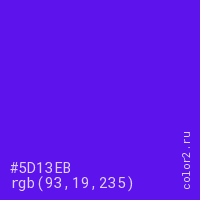 Цвет #5D13EB в цветовой модели RGB обозначается тремя октетами (93, 19, 235) в десятичном формате и #5D13EB в шестнадцатиричном (hex) формате, которые являются интенсивностью красного 93 (hex 5D), интенсивность зелёного 19 (hex 13) и интенсивность синего 235 (hex EB).