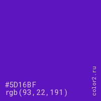 Цвет #5D16BF в цветовой модели RGB обозначается тремя октетами (93, 22, 191) в десятичном формате и #5D16BF в шестнадцатиричном (hex) формате, которые являются интенсивностью красного 93 (hex 5D), интенсивность зелёного 22 (hex 16) и интенсивность синего 191 (hex BF).