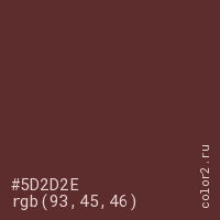 Цвет #5D2D2E в цветовой модели RGB обозначается тремя октетами (93, 45, 46) в десятичном формате и #5D2D2E в шестнадцатиричном (hex) формате, которые являются интенсивностью красного 93 (hex 5D), интенсивность зелёного 45 (hex 2D) и интенсивность синего 46 (hex 2E).