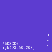 Цвет #5D3CD0 в цветовой модели RGB обозначается тремя октетами (93, 60, 208) в десятичном формате и #5D3CD0 в шестнадцатиричном (hex) формате, которые являются интенсивностью красного 93 (hex 5D), интенсивность зелёного 60 (hex 3C) и интенсивность синего 208 (hex D0).