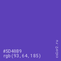 Цвет #5D40B9 в цветовой модели RGB обозначается тремя октетами (93, 64, 185) в десятичном формате и #5D40B9 в шестнадцатиричном (hex) формате, которые являются интенсивностью красного 93 (hex 5D), интенсивность зелёного 64 (hex 40) и интенсивность синего 185 (hex B9).