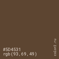 Цвет #5D4531 в цветовой модели RGB обозначается тремя октетами (93, 69, 49) в десятичном формате и #5D4531 в шестнадцатиричном (hex) формате, которые являются интенсивностью красного 93 (hex 5D), интенсивность зелёного 69 (hex 45) и интенсивность синего 49 (hex 31).