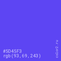 Цвет #5D45F3 в цветовой модели RGB обозначается тремя октетами (93, 69, 243) в десятичном формате и #5D45F3 в шестнадцатиричном (hex) формате, которые являются интенсивностью красного 93 (hex 5D), интенсивность зелёного 69 (hex 45) и интенсивность синего 243 (hex F3).