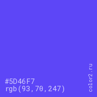 Цвет #5D46F7 в цветовой модели RGB обозначается тремя октетами (93, 70, 247) в десятичном формате и #5D46F7 в шестнадцатиричном (hex) формате, которые являются интенсивностью красного 93 (hex 5D), интенсивность зелёного 70 (hex 46) и интенсивность синего 247 (hex F7).