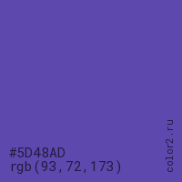 Цвет #5D48AD в цветовой модели RGB обозначается тремя октетами (93, 72, 173) в десятичном формате и #5D48AD в шестнадцатиричном (hex) формате, которые являются интенсивностью красного 93 (hex 5D), интенсивность зелёного 72 (hex 48) и интенсивность синего 173 (hex AD).