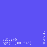 Цвет #5D50F5 в цветовой модели RGB обозначается тремя октетами (93, 80, 245) в десятичном формате и #5D50F5 в шестнадцатиричном (hex) формате, которые являются интенсивностью красного 93 (hex 5D), интенсивность зелёного 80 (hex 50) и интенсивность синего 245 (hex F5).