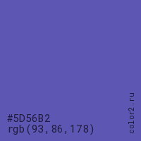 Цвет #5D56B2 в цветовой модели RGB обозначается тремя октетами (93, 86, 178) в десятичном формате и #5D56B2 в шестнадцатиричном (hex) формате, которые являются интенсивностью красного 93 (hex 5D), интенсивность зелёного 86 (hex 56) и интенсивность синего 178 (hex B2).