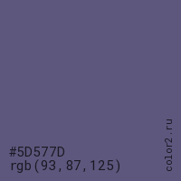 Цвет #5D577D в цветовой модели RGB обозначается тремя октетами (93, 87, 125) в десятичном формате и #5D577D в шестнадцатиричном (hex) формате, которые являются интенсивностью красного 93 (hex 5D), интенсивность зелёного 87 (hex 57) и интенсивность синего 125 (hex 7D).