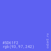 Цвет #5D61F2 в цветовой модели RGB обозначается тремя октетами (93, 97, 242) в десятичном формате и #5D61F2 в шестнадцатиричном (hex) формате, которые являются интенсивностью красного 93 (hex 5D), интенсивность зелёного 97 (hex 61) и интенсивность синего 242 (hex F2).
