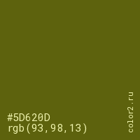 Цвет #5D620D в цветовой модели RGB обозначается тремя октетами (93, 98, 13) в десятичном формате и #5D620D в шестнадцатиричном (hex) формате, которые являются интенсивностью красного 93 (hex 5D), интенсивность зелёного 98 (hex 62) и интенсивность синего 13 (hex 0D).