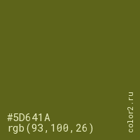 Цвет #5D641A в цветовой модели RGB обозначается тремя октетами (93, 100, 26) в десятичном формате и #5D641A в шестнадцатиричном (hex) формате, которые являются интенсивностью красного 93 (hex 5D), интенсивность зелёного 100 (hex 64) и интенсивность синего 26 (hex 1A).
