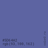 Цвет #5D64A2 в цветовой модели RGB обозначается тремя октетами (93, 100, 162) в десятичном формате и #5D64A2 в шестнадцатиричном (hex) формате, которые являются интенсивностью красного 93 (hex 5D), интенсивность зелёного 100 (hex 64) и интенсивность синего 162 (hex A2).