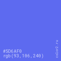 Цвет #5D6AF0 в цветовой модели RGB обозначается тремя октетами (93, 106, 240) в десятичном формате и #5D6AF0 в шестнадцатиричном (hex) формате, которые являются интенсивностью красного 93 (hex 5D), интенсивность зелёного 106 (hex 6A) и интенсивность синего 240 (hex F0).