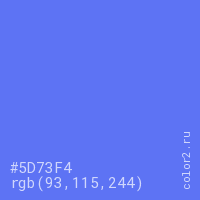 Цвет #5D73F4 в цветовой модели RGB обозначается тремя октетами (93, 115, 244) в десятичном формате и #5D73F4 в шестнадцатиричном (hex) формате, которые являются интенсивностью красного 93 (hex 5D), интенсивность зелёного 115 (hex 73) и интенсивность синего 244 (hex F4).