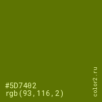 Цвет #5D7402 в цветовой модели RGB обозначается тремя октетами (93, 116, 2) в десятичном формате и #5D7402 в шестнадцатиричном (hex) формате, которые являются интенсивностью красного 93 (hex 5D), интенсивность зелёного 116 (hex 74) и интенсивность синего 2 (hex 02).