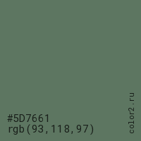 Цвет #5D7661 в цветовой модели RGB обозначается тремя октетами (93, 118, 97) в десятичном формате и #5D7661 в шестнадцатиричном (hex) формате, которые являются интенсивностью красного 93 (hex 5D), интенсивность зелёного 118 (hex 76) и интенсивность синего 97 (hex 61).