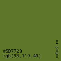 Цвет #5D7728 в цветовой модели RGB обозначается тремя октетами (93, 119, 40) в десятичном формате и #5D7728 в шестнадцатиричном (hex) формате, которые являются интенсивностью красного 93 (hex 5D), интенсивность зелёного 119 (hex 77) и интенсивность синего 40 (hex 28).