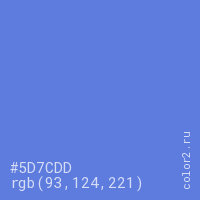 Цвет #5D7CDD в цветовой модели RGB обозначается тремя октетами (93, 124, 221) в десятичном формате и #5D7CDD в шестнадцатиричном (hex) формате, которые являются интенсивностью красного 93 (hex 5D), интенсивность зелёного 124 (hex 7C) и интенсивность синего 221 (hex DD).