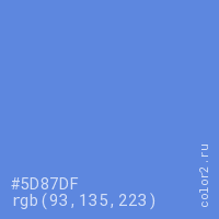 Цвет #5D87DF в цветовой модели RGB обозначается тремя октетами (93, 135, 223) в десятичном формате и #5D87DF в шестнадцатиричном (hex) формате, которые являются интенсивностью красного 93 (hex 5D), интенсивность зелёного 135 (hex 87) и интенсивность синего 223 (hex DF).