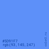 Цвет #5D91F7 в цветовой модели RGB обозначается тремя октетами (93, 145, 247) в десятичном формате и #5D91F7 в шестнадцатиричном (hex) формате, которые являются интенсивностью красного 93 (hex 5D), интенсивность зелёного 145 (hex 91) и интенсивность синего 247 (hex F7).
