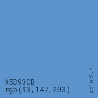 Цвет #5D93CB в цветовой модели RGB обозначается тремя октетами (93, 147, 203) в десятичном формате и #5D93CB в шестнадцатиричном (hex) формате, которые являются интенсивностью красного 93 (hex 5D), интенсивность зелёного 147 (hex 93) и интенсивность синего 203 (hex CB).